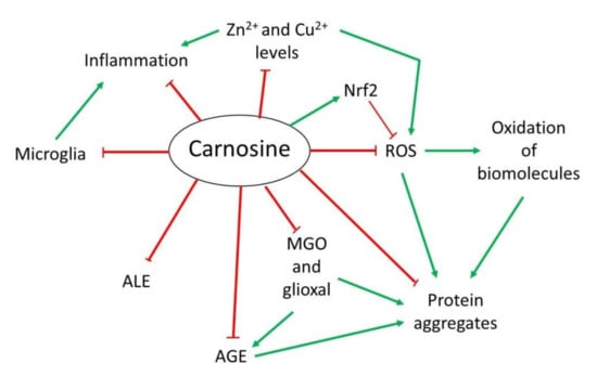 OS significantly contributes to the impairment of neuronal cells function through modifications of biomolecules, such as oxidation of lipids, DNA or proteins. Among them, proteins are the main targets of ROS due to the presence of residues that can easily react with these species, producing the addition of carbonyl groups [42]. In addition to proteins, the carbonylation of sugars and lipids leads to the formation of advanced glycation end-products (AGEs) and advanced lipoxidation end-products (ALEs), respectively, which are a cluster of heterogeneous molecules generated in a non-enzymatic reaction that play an important role in several NDs [13,20,43]. Carnosine can inhibit AGEs and ALEs formation by detoxifying reactive carbonyl species through its imidazole ring, in a similar manner than ROS [13,43]. In this context, carnosine has been proved useful in preventing the reactivity of methylglyoxal (MGO) and glyoxal, which are carbonyl compounds that can produce protein glycation and aggregation [13,44]. In particular, carnosine was shown to reduce OS and carbonylation levels in rats treated with MGO [45]. As for antioxidant activity, the increase in Nrf2 pathway activity by carnosine should also be considered in the carbonyl quenching mechanism. Nrf2 activates the expression of several antioxidant enzymes and oxidoreductases, which convert carbonyl compounds in less reactive products such as alcohols or carboxyl derivatives [13]. Interestingly, the activation of Nrf2 also explains the ability of carnosine to decrease AGEs formation from MGO and glyoxal [43].