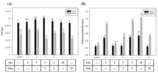 Effect of adding tryptophan and formic acid at different time points on (A) cell growth and (B) violacein production of C. violaceum. The different addition timing permutations of tryptophan and formic acid are presented in the table below the graph. T: 0.3 mg/mL tryptophan; F: 160 µg/mL formic acid. Each value is expressed as mean ± standard deviation (n = 3). Different superscripts are significantly different (p < 0.05).