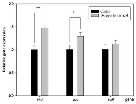 Effect of formic acid on the gene expression of vioA, cviI, and cviR in C. violaceum. Each value is expressed as mean ± standard deviation (n = 3). Asterisk represents a significant difference (* p < 0.05, ** p < 0.01).