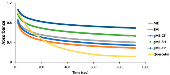 The samples analyzed to determine the antioxidant activity of curcumin were M1, ME, SM, gME-CT, gME-SH, and gME-CP, whose composition and quantity of curcumin are indicated in Table 1. Curcumin dissolved in ethanol was used as a reference for CURC antioxidant activity in standard solution, and quercetin solution was employed as a positive control. The method described in the literature [4,11,35] was adapted according to the specific characteristics of the studied samples. A stock solution of DPPH with a concentration of 40 mg/L was used. A volume of 2.5 mL of solution was analyzed on a UV-VIS spectrophotometer, of which 10 μL was sampled, and the rest was a stock solution of DPPH. For the stock solution of DPPH, absorbance was recorded and the resulting value represented the absorbance at time t = 0 (A0), for each of the samples. For sample M1, the absorbance was recorded, beginning 10 s after mixing the DPPH stock solution with the sample. For the rest of the samples, the absorbance was recorded beginning with 20 s; because of high viscosity, a longer time was needed to ensure the homogeneity of the final solution. Thus, this aspect was taken into account in the graphic representations and time corrections were made. The absorbance was recorded by the spectrophotometer every 2 s for 900 s.