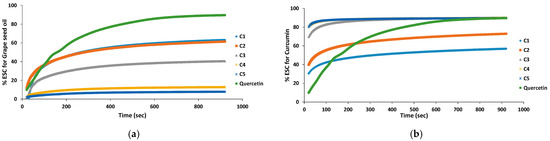 Variation of the % ESC for individual components Grape seed oil (a) and for curcumin (b) at various concentrations equivalent to concentrations at the selected grape seed oil-curcumin mixtures investigated for synergistic effect, at different ratio (v/v): C1 corresponds to 10:1 (v/v) ratio; C2 corresponds to 4.5:10 (v/v) ratio; C3 corresponds to 1:1 (v/v) ratio; C4 corresponds to 1:5 (v/v) ratio; C5 corresponds to 1:10 (v/v) ratio.