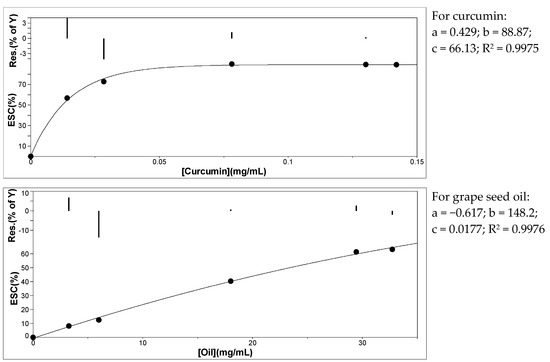 The changes in the scavenging capacity of curcumin and grape seed oil measured with the DPPH free radical are shown in Figure 6. Curcumin is a very efficient antioxidant, the scavenging capacity being over 50% at a concentration of 14 μg/mL. By comparison, for a similar antioxidant activity for grape seed oil, its concentration must be around 30 mg/mL. For both curcumin and grape seed oil, after 15 min the absorbance of DPPH remains almost constant; the reaction appears to be dose-dependent for both antioxidants (Figure 6), the scavenging activity reaching a maximum at a certain antioxidant concentration ([ao]).