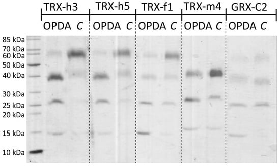 Blocking of exposed thiols of TRXs and GRXC2 by OPDA as indicated by less mPEGmal binding. Recombinant TRX-h3, TRX-h5, TRX-f1, TRX-m4 and GRX-C2 were reduced and desalted, and either treated with 150 µM OPDA or the equivalent amount of the solvent ethanol (“C”). Samples were treated with mPEG-maleimide 5000 to label free thiols. Shifts to increased apparent molecular mass indicates thiol accessibility for modification, while the lack of shifts indicates inaccessibility of thiols after treatment with OPDA. Similar results were seen in 4 experiments. Band quantification is presented in Supplementary Figure S1.