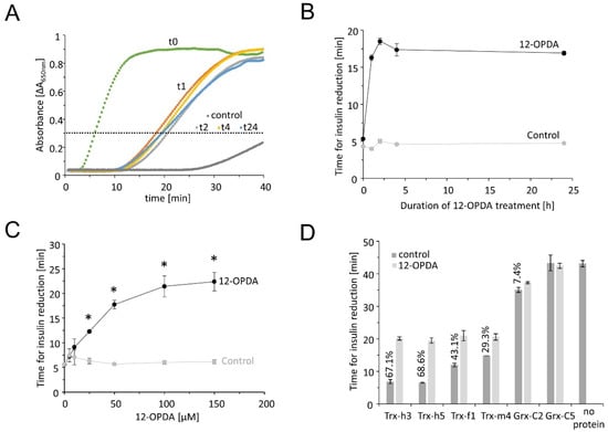 Insulin reduction catalyzed by the redox transmitters TRX-f1, -m4, -h3, -h5 or GRX-C2 with or without 150 µM OPDA pretreatment. Recombinant TRX-f1, TRX-m4, TRX-h3, TRX-h5 and GRX-C2 were reduced and desalted, and either treated with OPDA or the equivalent amount of ethanol as solvent control. In total, 160 µM insulin was placed in the well of a 96-well plate and 5 µM test protein added at t = 0 min. Absorbance increase indicates reduction and precipitation of insulin. (A) Exemplary spectroscopic recordings with TRX-h3. The horizontal line indicates the threshold for detailed analysis. Protein was incubated with 12-OPDA for 0 (referred to as t0), 1 (t1), 2 (t2), 4 (t4) or 24 (t24) hours prior to the insulin reduction assay. Additionally, the DTT control is shown in grey. In this case, the absorbance recording remained below the threshold throughout the recorded time span. (B) Time-dependent effect of OPDA on reduction activity of TRX-h3. Data are means ± SD of n = 5. Time [min] refers to the time needed to reach the threshold of ΔA650 nm = 0.3. (C) Concentration-dependent effect of OPDA treatment for 1 h on activity of TRX-h3. Data are means ± SD of n ≥ 4. Significance of difference was determined using t-test (p < 0.001) and is marked with *. (D) Comparison of activity of the redox transmitters and inhibitory effect of OPDA [%]. Data are means ± SD of n = 5.