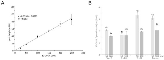 Quantification of OPDA residues bound to TRX-f1, -m4, -h3 and -h5 by HPLC analysis. In total, 200 µM of 12-OPDA was incubated with either 50 or 100 µM of recombinant TRX-h3, TRX-h5, TRX-f1 and TRX-m4 or an equivalent amount of phosphate buffer. Proteins were reduced and desalted prior to the incubation. After 2 h, the amount of free unbound OPDA was determined by reverse phase HPLC. The determined remaining free OPDA was then subtracted from the total amount used for incubation with protein to obtain the amount of OPDA bound to the protein. This value was further divided by the protein concentration to obtain the molar OPDA/protein ratio. (A) Different OPDA concentrations were used to generate a standard curve based on peak height [mAU] at the retention time of 14.200 ± 0.014 min. Data are means ± SD of n ≥ 3. (B) Ratio of OPDA bound to recombinant TRX-f1, TRX-m4, TRX-h3 and TRX-h5 with molar excess of OPDA indicated above each bar. The change in free OPDA concentration was calculated using the standard curve shown in (A). Data are means ± SD of n ≥ 3.