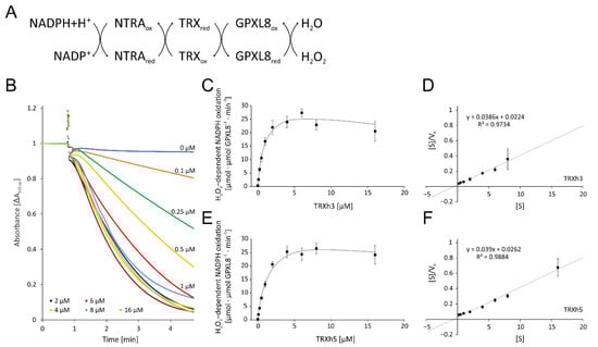 Optimization of the glutathione peroxidase-dependent H2O2 detoxification assay. (A) Scheme of the reaction sequence. (B) Representative spectrophotometric recordings adjusted to identical time point of H2O2 addition and similar baselines of TRXh3 concentration-dependent reduction of H2O2 by 3 µM GPXL8. The assay contained 1 µM NTRA, 200 µM NADPH, 300 µM H2O2 and variable TRXh3 concentrations as indicated. The initial linear rate was used for quantification. (C) TRXh3 concentration dependency. (D) Hanes–Woolf plot of GPXL8 and 0.25–8 µM TRXh3 as electron donor according to (C). (E) TRXh5 concentration dependency. (F) Hanes–Woolf plot of GPXL8 and 0.25–16 µM TRXh5 as electron donor according to (E). Data are means ± SD of n ≥ 6 (C–F).