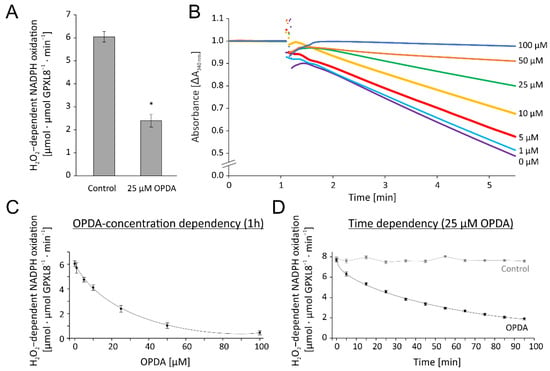The previous results had shown that the reconstituted GPXL8 assay was highly active in detoxifying H2O2. In an initial test for OPDA effects, we preincubated the reaction mixture with 25 µM OPDA for 1 h or the solvent ethanol as respective control. Their addition to the reconstituted GPXL8 test resulted in an inhibition by 60% (Figure 6A). Based on this preliminary indication for interference of OPDA with the test system and, derived from the above optimization, we opted for 0.25 µM TRX-h3 as the concentration of the redox transmitter in the subsequent tests for the OPDA effect. The recordings presented in Figure 6B,C show the concentration-dependent inhibition of the NADPH-driven H2O2 reduction after the addition of 10–100 µM OPDA to the cuvette contents 1 h prior to the start of the recording. The kinetics of the inhibition by 25 µM OPDA is shown in Figure 6D. The data show the high efficiency of OPDA to inactivate the test by >50% after 1 h of incubation with 25 µM OPDA (Figure 6D), and half inhibition at approximately 16 µM OPDA after 1 h of incubation (Figure 6C).