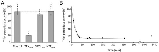 Relative glutathione peroxidase-dependent H2O2 detoxification after preincubation of single components with OPDA. (A) In total, 20 µM reduced and desalted recombinant protein (NTRA, TRX-h3 or GPXL8) was preincubated with 150 µM OPDA for 1h. The pretreated proteins were added to the otherwise untreated assay components as described before: 200 µM NADPH, 1 µM NTRA, 0.25 µM TRX-h3, 3 µM GPXL8 and 300 µM H2O2. To ensure comparative results, the final OPDA concentration in the reaction mix was 22.5 µM OPDA always. The GPXL8 activity was measured and related to measurements in absence of OPDA but pretreated with the solvent ethanol. Data are means ± SD of n = 6. Significance of difference between the components was determined using ANOVA, followed by post hoc Tukey test and is marked with letters a and b. * marks significant differences to corresponding measurements without OPDA as determined by t-test (p < 0.05). (B). In total, 20 µM reduced TRX-h3 was incubated with 150 µM OPDA and the time-dependent effect of OPDA on TRX-h3-dependent GPXL8 activity was measured for 24 h. The assay contained 200 µM NADPH, 1 µM NTRA, 0.25 µM preincubated TRX-h3, 3 µM GPXL8 and 300 µM H2O2. Data are means ± SD of n = 3.