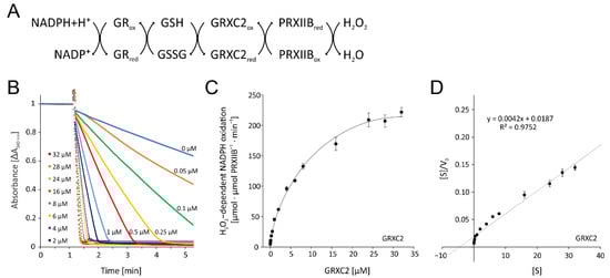 Optimization of the peroxiredoxin IIB-dependent peroxide detoxification assay using the reconstituted system. (A) Scheme of the reaction sequence. (B) Representative spectroscopic recordings matched to the time point of H2O2 addition and similar baselines of GRXC2 concentration-dependent reduction of H2O2 by 3 µM PRXIIB. The assay contained 200 µM NADPH, 1 µM GR, 2 mM glutathione, 3 µM PRXIIB, 300 µM H2O2 and variable GRXC2 concentrations as indicated. The initial linear rate was used for quantification. (C) GRXC2 concentration dependency of H2O2 reduction by PRXIIB. (D) Hanes–Woolf plot of PRXIIB and 0.05–32 µM GRXC2 as electron donor according to (C). Data are means ± SD of n = 6 (C,D).