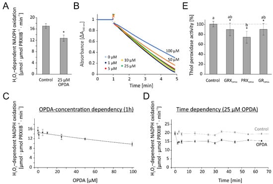Initially, the inhibitory effect of 25 µM OPDA on PRXIIB was measured. This concentration was effective in inhibiting GPXL8 activity; however, PRXIIB activity was only slightly affected (Figure 9A). The effect of OPDA on the PRXIIB-dependent H2O2 detoxification cascade was then further explored by adding various amounts of OPDA in the range of 1–100 µM to the assay. High concentrations of 25–100 µM were required to achieve significant inhibition (Figure 9C). The time-dependent measurement revealed a rapid effect of OPDA on PRXIIB activity within less than five minutes (Figure 9D). To identify the target of OPDA within the PRXIIB peroxidase assay, the single components were preincubated with 150 µM OPDA for 1 h. OPDA seems to act directly on PRXIIB at a low level and only showed an insignificant effect on OPDA-treated GRX and GR (Figure 9E).