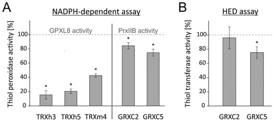 Besides the direct impact of OPDA on PRXIIB, the sensitivity of the electron donors TRX-h3, TRX-h5, TRX-m4 and GRXC2, GRXC5 of GPXL8 and PRXIIB, respectively, was investigated by preincubation with OPDA (Figure 10). It turned out that TRXs were more sensitive towards OPDA than GRXs (Figure 10A). All three analyzed TRXs were sensitive to OPDAylation, but the cytosolic TRXs showed an inhibition of roughly 80%, while the chloroplastic TRX-m4 resulted in an inhibition of only 60%. The low sensitivity of GRXC2 and GRXC5 was confirmed by the GRX-specific HED assay, which is independent of the electron acceptor PRXIIB. Here, GRXC2 showed even no significant inhibition by OPDA (Figure 10B). The quantitative differences should be considered with care, because the tests could not be conducted in identical design due to different efficiency of the various redox transmitters in the assays.