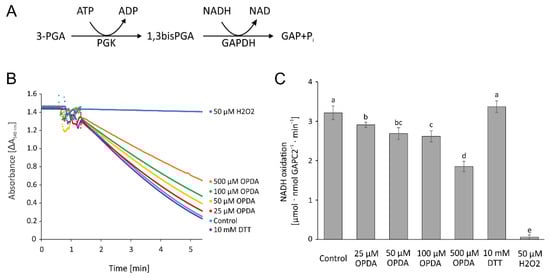 OPDA effect on cytosolic glyceraldehyde-3-phosphate dehydrogenase C2 activity. (A) Reaction scheme. (B) Representative absorbance recordings normalized to the identical time point of GAPC2 addition and similar baselines after the addition of 15 nM GAPC2. In total, 1 µM reduced and desalted GAPC2 was pre-incubated with 25–500 µM OPDA, 50 µM H2O2, and 10 mM DTT, respectively, and in the presence of 140 µM NAD for 1 h and then transferred to the GAPC2-activity test. The control containing the equivalent amount of the solvent ethanol was also preincubated for 1 h. The test contained 4 mM ATP, 8 mM 3-phosphoglycerate, 90 nM A. thaliana phosphoglycerate kinase, 260 µM NADH+H+ and 15 nM GAPC2. (C) OPDA concentration-dependent GAPC2 activity as described in (B). Data are means ± SD of n ≥ 6. Significance of difference was determined using ANOVA, followed by post hoc Tukey test and is marked with letters a–e.