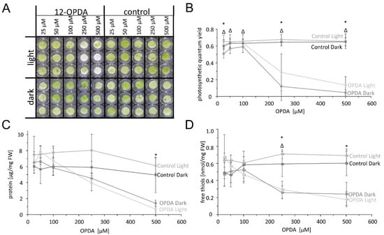 To get further insight into the physiological effects of OPDA in vivo, we performed Arabidopsis leaf disc assays. Leaf discs were exposed to OPDA at different concentrations (25, 50, 100, 250 or 500 µM) for 24 h in continuous light or darkness. When subjected to these conditions, the combination of light and high OPDA concentrations (250 and 500 µM) induced a loss of chlorophyll, but no visible damage was observed in the control samples or in the dark (Figure 12A). The leaf status was scrutinized by three parameters. The determination of quantum yield of photosystem II (PSII) revealed a severe concentration-dependent effect of OPDA on the photosynthetic electron transport chain both in light and dark (Figure 12B). Similar patterns were obtained for the contents of protein and free thiols (Figure 12C,D), with the difference that treatment with 250 µM OPDA strongly inhibited the quantum yield of photosystem II (Figure 12B) and lowered the contents of non-protein thiols (Figure 12D), but had much less effect on protein contents.