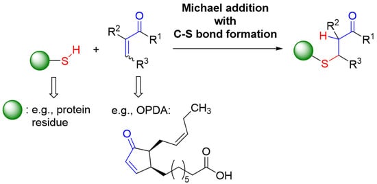 Compounds with an α,β-unsaturated carbonyl moiety have electrophilic properties and react with thiols through the addition of the thiols to the C=C double bond of this Michael acceptor and resulting C-S bond formation at the carbon being in β-position of the Michael acceptor (Figure 13).
