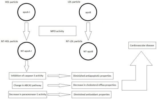 The MPO-dependent oxidative modification of HDL particles leads to a change in cholesterol transport through the ATP-binding cassette transporter A1 (ABCA1) pathway [112]. LDL nitration is associated with the formation of cholesterol-rich cells, a key feature of atherosclerosis [113].