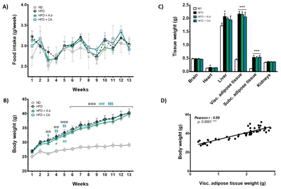 Effect of HFD and polyphenols on food intake, body and tissue weights, and fat deposits. Mice were exposed to a normal diet (ND) or a high-fat diet (HFD) in the presence or not of A. borbonica polyphenolic extract (HFD + A.b; 35 mg per kg body weight) or caffeic acid (HFD + CA; 35 mg per kg body weight) for 12 weeks before cerebral ischemia-reperfusion: (A) Food intake and (B) body weight were measured every week through 12 weeks; (C) weights of the brain, heart, liver, kidneys and both visceral (visc) and subcutaneous (subc) adipose tissues were measured at the end of the experimental period; (D) statistical correlation between total body weight and visceral adipose tissue weight was determined. Data were expressed as means ± SEM of n ≥ 5. ¤¤ p < 0.01 and ¤¤¤ p < 0.005 for HFD vs. ND. # p < 0.05, ## p < 0.01 and ### p < 0.005 for HFD + A.b vs. ND. § p < 0.05, §§ p < 0.01 and §§§ p < 0.005 for HFD + CA vs. ND. * p < 0.05 and *** p < 0.005 vs. ND.