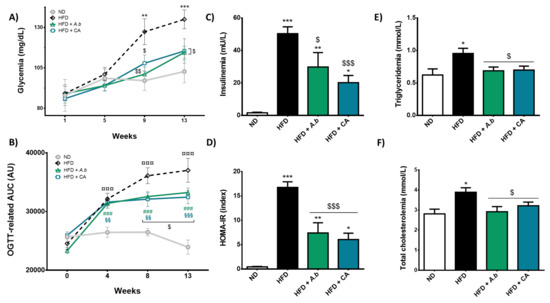 We assessed whether HFD-induced obesity was associated with systemic metabolic disorders. Results show that fasting blood glucose levels measured in HFD-exposed mice were significantly higher than those determined in the control ND group (Figure 3A), after a 9-week experimental period and until the end of the experiment. Interestingly, exposure of mice to A. borbonica polyphenols or caffeic acid significantly reduced glycemia from 135.0 mg/dL in the HFD group to 114.5 and 115.4 mg/dL at the end of the experimental period, respectively. Concordantly, polyphenols significantly attenuated HFD-associated glucose intolerance measured monthly by OGTT assay (Figure 3B). Moreover, while HFD led to an up-regulation of insulinemia (Figure 3C) and HOMA-IR index (Figure 3D), A. borbonica polyphenols and caffeic acid significantly decreased these markers of insulin resistance. These results suggest the capacity of polyphenols to limit hyperglycemia, hyperinsulinemia and insulin resistance in obese mice. Additionally, polyphenols improved dyslipidemia, by reducing the circulating levels of triglycerides (Figure 3E) and total cholesterol (Figure 3F) that were increased by HFD.