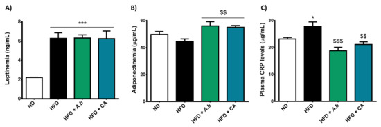 Effect of HFD and polyphenols on leptinemia, adiponectinemia and plasma CRP levels. Mice were exposed to a normal diet (ND) or a high-fat diet (HFD) in the presence or not of A. borbonica polyphenolic extract (HFD + A.b; 35 mg per kg body weight) or caffeic acid (HFD + CA; 35 mg per kg body weight) for 12 weeks before a cerebral ischemia-reperfusion. After a cerebral ischemia of 90 min and 20 h of reperfusion, (A) leptinemia, (B) adiponectinemia and (C) plasma CRP levels were determined by ELISA kits. Data were expressed as means ± SEM of n ≥ 5. * p < 0.05 and *** p < 0.005 vs. ND. $$ p < 0.01 and $$$ p < 0.005 vs. HFD.