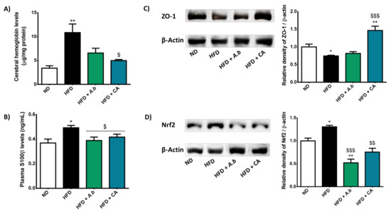 Effect of HFD and polyphenols on markers related to hemorrhagic transformation, BBB disruption and oxidative stress. Mice were exposed to a normal diet (ND) or a high-fat diet (HFD) in the presence or not of A. borbonica polyphenolic extract (HFD + A.b; 35 mg per kg body weight) or caffeic acid (HFD + CA; 35 mg per kg body weight) for 12 weeks before a cerebral ischemia-reperfusion. After a cerebral ischemia of 90 min and 20 h of reperfusion, (A) cerebral hemoglobin levels and (B) plasma S100β levels were determined by ELISA kits; (C) ZO-1 tight junction and (D) Nrf2 redox-sensitive transcriptional factor production was determined by Western blotting and normalized against β-actin housekeeping protein level in the cerebral infarcted hemisphere. Data were expressed as means ± SEM of n ≥ 5. * p < 0.05 and ** p < 0.01 vs. ND. $ p < 0.05, $$ p < 0.01 and $$$ p < 0.005 vs. HFD.