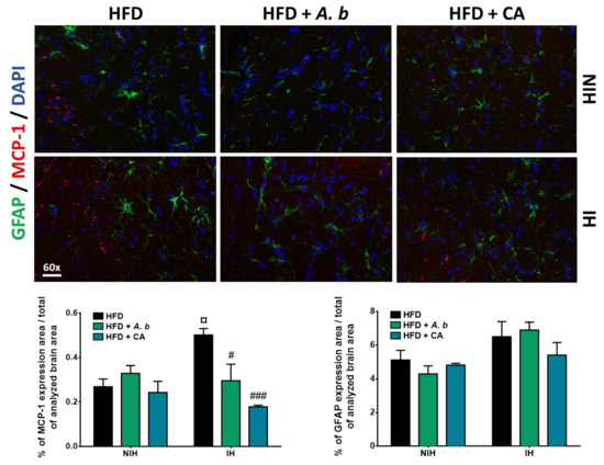Effect of HFD and polyphenols on GFAP astrocyte marker and MCP-1 pro-inflammatory chemokine production in the brain. Mice were exposed to a normal diet (ND) or a high-fat diet (HFD) in the presence or not of A. borbonica polyphenolic extract (HFD + A.b; 35 mg per kg body weight) or caffeic acid (HFD + CA; 35 mg per kg body weight) for 12 weeks before a cerebral ischemia-reperfusion. After a cerebral ischemia of 90 min and 20 h of reperfusion, GFAP and MCP-1 were detected by immunohistochemistry in the cerebral non-infarcted hemisphere (NIH) and infarcted hemisphere (IH). Nuclei were counterstained by using DAPI. The percentage of immunostaining area/total of analyzed brain area was calculated for GFAP and MCP-1. Data were expressed as means ± SEM of n ≥ 3. ¤ p < 0.05 vs. HFD-NIH. # p < 0.05 and ### p < 0.005 vs. HFD-IH.