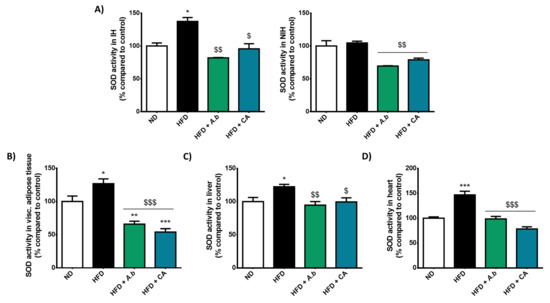 Effect of HFD and polyphenols on the cerebral and peripheral antioxidant SOD activities. Mice were exposed to a normal diet (ND) or a high-fat diet (HFD) in the presence or not of A. borbonica polyphenolic extract (HFD + A.b; 35 mg per kg body weight) or caffeic acid (HFD + CA; 35 mg per kg body weight) for 12 weeks before a cerebral ischemia-reperfusion. After a cerebral ischemia of 90 min and 20 h of reperfusion, the total SOD activity was measured (A) in the cerebral non-infarcted hemisphere (NIH) and infarcted hemisphere (IH), (B) visceral (visc) adipose tissue, (C) liver and (D) heart. Data were expressed as means ± SEM of n ≥ 5. * p < 0.05, ** p < 0.01 and *** p < 0.005 vs. ND. $ p < 0.05, $$ p < 0.01 and $$$ p < 0.005 vs. HFD.
