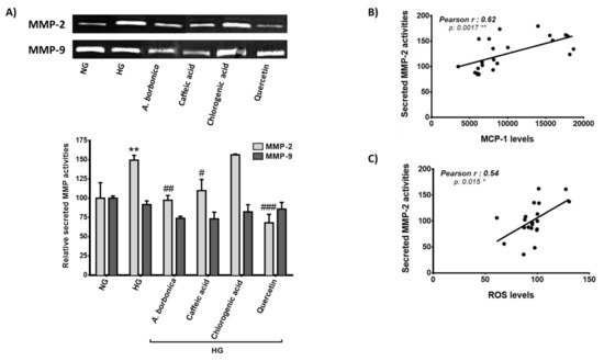 Our data described above show that HFD-induced obesity led to insulin resistance-mediated hyperglycemia, aggravated BBB disruption markers, as well as cerebral pro-inflammatory and redox alterations during stroke. In order to establish a mechanistic link between loss of BBB integrity, neuroinflammation and oxidative stress, we assessed the impact of hyperglycemic condition on the activity of both MMP-2 and MMP-9 known to be involved in BBB breakdown. For this experiment, murine bEnd3 cerebral endothelial cells were exposed to normoglycemic or hyperglycemic conditions in the presence or not of A. borbonica polyphenolic extract or pure quercetin, caffeic or chlorogenic acids detected as major polyphenols in the plant extract. Activities of secreted MMP-2 and MMP-9 were measured by zymography analysis. We found that hyperglycemic condition led to a significant increase in MMP-2 activity without changing that of MMP-9 (Figure 9A). Interestingly, the polyphenolic extract of A. borbonica protected against hyperglycemic condition-mediated MMP-2 activation. Quercetin and caffeic acid were able to exert a similar beneficial action, leading to suggest their possible involvement in the bioactivity of A. borbonica extract. Moreover, we found a significant positive correlation, on the one hand between MMP-2 activity and MCP-1 secreted level (Figure 9B), and on the other hand between MMP-2 activity and ROS intracellular level (Figure 9C). Taken together, these results raise the possibility of MMP-2 involvement in cerebral endothelial cell permeability and BBB disruption during neuroinflammation and oxidative stress aggravated by HFD in obese and hyperglycemic mice during stroke, and show the protective action of polyphenols able to target MMP-2 activity.