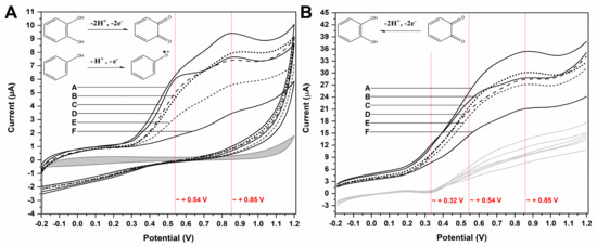 Considering that upon behaving as reducing agents, the catechol moiety of polyphenols is converted to a quinone, it can be suggested that the proposed phytochemical markers would follow a similar redox mechanism, which has as a main feature the equivalence of the number of transferred electrons and protons [50]. The presence of catechol-quinone reversible systems in products with vegetal origins has been reported by many authors in electroanalytical investigations, and is further corroborated by the electro-accumulations in the HOMO mapping (Table 1), thereby hinting at the role of these regions in the charge-transfer reaction [23]. Nonetheless, this observation led us to propose the participation of these moieties in the electro-oxidation and electro-reduction reactions that sourced the faradaic outputs observed in the voltammetric assays (Figure 1 and Figure 2). Moreover, the formation of catechol-quinone systems has not only been correlated to antioxidant capacity but has also been presented as a means to establish sample identification through voltammetric fingerprinting [21].