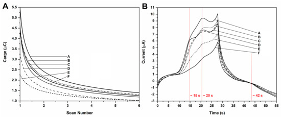 After CV analysis, the integrated charge of the chronocoulograms was plotted against the scan number (n = 1 to 6), and the chronoamperogram was extracted to validate the observations made through CV, as well as to check the time at which the signals were visible upon a scan rate of 50 mVs−1. Results are presented in Figure 2.