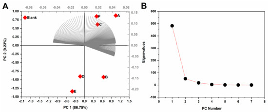 (A) PCA biplot of the electric current of the first CV scan of each of the samples (label variables in red). The amount of variance explained by each PC is therein informed in percentage, and the eigenvectors of the discrete electric current values is therein represented in gray. (B) Plot of the eigenvalues versus PC number, which was used to refine the PCA.