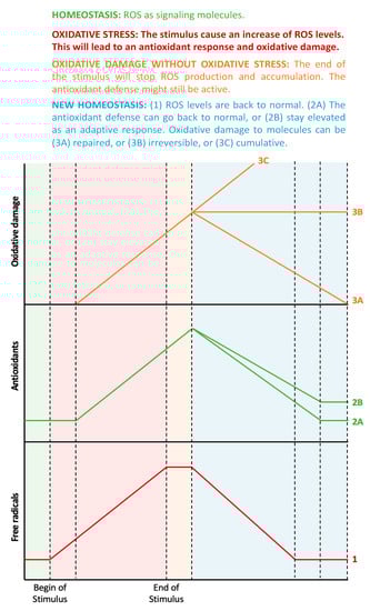 From oxidative stress to oxidative damage: chronological aspects. In homeostatic conditions (the green-shaded area), there is a small amount of ROS that acts as signaling molecules, and the corresponding antioxidant systems maintain ROS at physiological levels. When a prooxidant stimulus appears (pink-shaded area), ROS levels increase, and, therefore, the antioxidant defenses will also increase, but with some delay. During this phase, ROS levels are higher than the antioxidant defenses, thus leading to oxidative stress, which, in turn, will lead to oxidative damage to biomolecules. All these factors (ROS, antioxidant defenses, and oxidative damage to biomolecules) will continue to increase while the stimulus exists. When the stimulus disappears (orange-shaded area), ROS levels will no longer increase, but the remaining ROS molecules will continue to stimulate the antioxidant system and damage molecules. During this phase, there is no more imbalance between ROS and antioxidants, thus, there is no oxidative stress, even though there is still oxidative damage to biomolecules. Finally, the organism aims to return to homeostasis (blue-shaded area), but the antioxidant defenses can decrease to the previous levels or stay elevated as an adaptive response. Similarly, the oxidative damage to biomolecules can be repaired by autophagy or can be accumulative and even irreversible (probably leading to cell death).
