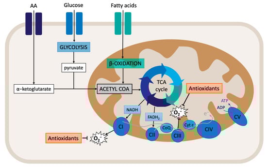 Cellular respiration starts with the supply of substrates. Glucose metabolism (glycolysis) produces pyruvate, which is then transformed into acetyl-CoA. Acetyl-CoA is also produced from fatty acid beta-oxidation. Within the mitochondrial matrix, acetyl-CoA enters the TCA cycle and is converted to citrate. At the same time, a-ketoglutarate, which is derived from the hydrolysis of extracellular amino acid glutamine to glutamate, also enters the TCA cycle (Figure 2). The final products of the TCA cycle are the reducing equivalents NADH and FADH2, which feed the ETC by transferring electrons to complexes I and II. This process is associated with the translocation of protons across the mitochondrial inner membrane, creating the electrochemical gradient that provides the necessary potential for the ATP synthase (complex V) to produce ATP from ADP and Pi [89,90]. The mitochondrial membrane potential (MMP) is an important component of the electrochemical gradient. An increase in the MMP causes elevated ATP production and reduced electron transport capacities, thus leading to increased ROS production [91]. Indeed, the MMP is critical for maintaining the physiological function of the respiratory chain. The process of oxidative phosphorylation itself is a major source of ROS. Around 1% of the electrons that enter the ETC do not follow the normal flow; instead, they are leaked out of the ETC, and, subsequently, they interact with oxygen to produce ROS [90,92]. Therefore, assessing the MMP and mitochondrial respiration can provide important clues regarding the oxidative stress state of the cell.