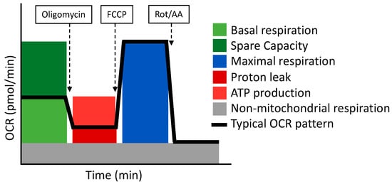 The Cell Mito Stress Test uses three modulators of respiration that inhibit specific components of the ETC. These compounds are oligomycin, FCCP, and a mix of rotenone and antimycin A. Each inhibitor targets a specific component of the ETC (Table 4 and Figure 3). Oligomycin inhibits the ATP synthase (complex V); the decrease observed in OCR following the injection of oligomycin correlates to the mitochondrial respiration associated with cellular ATP production. FCCP is an uncoupling agent that collapses the proton gradient and disrupts the MMP. Consequently, electron flow through the ETC is uninhibited and oxygen consumption reaches its maximum by the entire ETC. The FCCP-stimulated OCR is used to calculate the spare respiratory capacity, defined as the difference between maximal respiration and basal respiration. The mixture of rotenone (a complex I inhibitor) and antimycin A (a complex III inhibitor) stops mitochondrial respiration and enables the calculation of non-mitochondrial respiration driven by processes that are independent of the mitochondria [110].