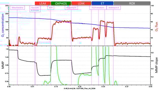 The first injection is pyruvate followed by malate, to evaluate the LEAK respiration. Because of this injection, O2 flux (O2 consumption dependent on complex I) increases slightly, which is followed by a hyperpolarization of the mitochondrial membrane. Injection 2 is ADP, to assess the OXPHOS capacity. O2 consumption increases and triplicates its previous value; and at the same time, the MMP returns to its normal levels. Injection 3 is oligomycin, which allows for the reevaluation of the LEAK respiration. O2 consumption decreases and the accumulation of protons in the intermembrane space by the inhibition of ATP synthase leads again to the hyperpolarization of the MMP. Then, injection 4 is FCCP titrations, to analyze the ET capacity. FCCP elevates respiration and, thereby, O2 consumption increases. This uncoupler also depolarizes the mitochondrial membrane in a concentration-dependent manner until the MMP collapse is reached. Finally, antimycin A is injected to evaluate ROX. Antimycin A blocks respiration by inhibiting complex III. Thus, the graph displays low levels of O2 flux which represent the residual O2 consumption. Moreover, the injection of antimycin A does not further affect the MMP. During the whole length of the assay, the O2 concentration (blue line) progressively decreases.