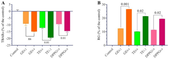 Effect of different antioxidants supplementation (g/kg diet) on changes of thiobarbituric reactive substances (TBARs; (A)) and reduced glutathione (RG; (B)) contents as a percent of the control in testes homogenate of male Nile tilapia, O. niloticus. GE, ginseng extract; TT, Tribulus terrestris extract; DPPG, date palm pollen grains. (n = 15) ns: non-significant, 0.05–0.001 the t-test significant levels of actual parameter values.