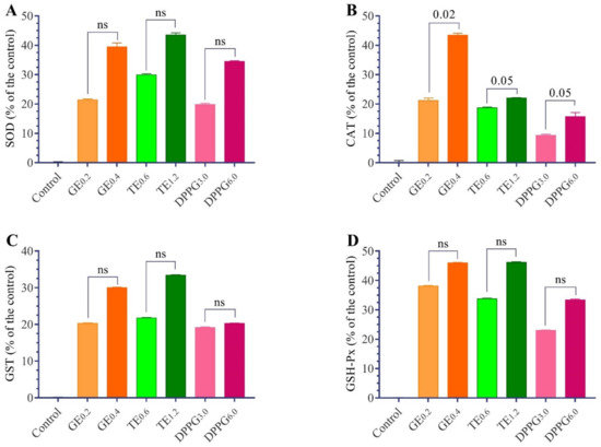 Effect of different antioxidants supplementation (g/kg diet) on changes of superoxide dismutase (SOD; (A)); catalase (CAT; (B)); glutathione-S-transferase (GST; (C)) and glutathione peroxidase (GSH-Px; (D)) activities as a percent of the control in testes homogenate of Nile tilapia, O. niloticus. GE, ginseng extract; TT, Tribulus terrestris extract; DPPG, date palm pollen grains. (n = 15) ns: non-significant, 0.05–0.001 indicates t-test significant levels of actual parameter values.