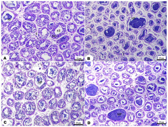 A small piece of the testes was removed from the experimental fish and rapidly placed in an adequate amount of 10% neutral buffered formalin for at least 24 h. The fixed specimens were processed through the conventional paraffin embedding technique (dehydration through ascending grades of ethanol, clearing in chloroform, and finally embedding in melted paraffin wax at 60 °C). Paraffin blocks were sectioned into 5 microns-thick sections stained with Hematoxylin and Eosin (H&E) according to the method described by Culling [42]. The stained sections were investigated using a light microscope at 100× magnification (B-293 LD 1.50, Optika, Via Rigla, Ponteranica, Italy). The percentage of active seminiferous tubules (ST) was measured by the determination of the number of ST containing a considerable amount of spermatids/100 ST at a power of 100× in five consecutive sections.