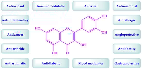 Quercetin (yellowish crystals; insoluble in water; soluble in acetic acid/alkali solutions; slightly soluble in alcohol; CAS registry number: 117-39-5; molecular weight: 302.24; melting point: 316.5 °C; chemical name: 2-(3,4-dihydroxyphenyl)-3,5,7-trihydroxy-4H-chromen-4-one) is a flavonol, which is found in many fruits (grape, apple, strawberry, cloudberry, and raspberry), and vegetables (onion, tomato, lettuce, and green bean) [18]. The chemical structure of quercetin is depicted in Figure 1. Quercetin contains four phenolic groups, which make it a strong scavenger of the reactive oxygen species (ROS), antioxidant, immune booster, and anti-inflammatory substance [18]. Quercetin is also an excellent metal ionophore (antioxidative, anti-inflammatory, and immunomodulatory zinc ionophore) [19], and also increases the glutathione (antioxidant) level in the body [20]. These properties make quercetin an important therapeutic agent to prevent/treat many diseases caused by oxidative stress and the release of pro-inflammatory substances in the body (Figure 1) [18,21,22].