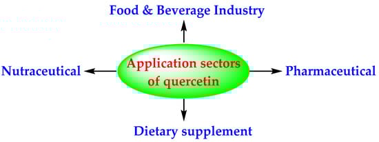 Quercetin is obtained from the hydrolysis of rutin (a quercetin glycoside) [18]. The United States Food and Drug Administration (USFDA) designated quercetin as a GRAS (generally recognized as safe) substance, up to a level of 500 mg/day [23]. The releasable information (parts 1, 2, and 3) of the GRAS notice number 341 of the USFDA discusses the chemistry, manufacturing process, stability/photostability, impurities, metabolism, toxicology, clinical studies, and reason for granting the GRAS status to quercetin. In short, this states that the shelf life of pure quercetin is about 5 years; quercetin is absorbed from the stomach with 24–53% bioavailability; quercetin forms a albumin–quercetin complex that may be toxic in chronic use, but the limited bioavailability of quercetin prevents this event from happening; quercetin does not produce systemic toxicity up to 2.231 g/kg/day, or carcinogenicity; quercetin does not adversely impact the CYP450 enzymes and does not deplete the glutathione enzyme; quercetin is metabolized to two non-carcinogenic compounds, namely, 3′-O-methylquercetin and 4′-O-methylquercetin, and is excreted via urine as well as feces. Being a GRAS product, quercetin is used in nutraceuticals, the food/beverage industry, and as a diet supplement (Figure 2) [24].