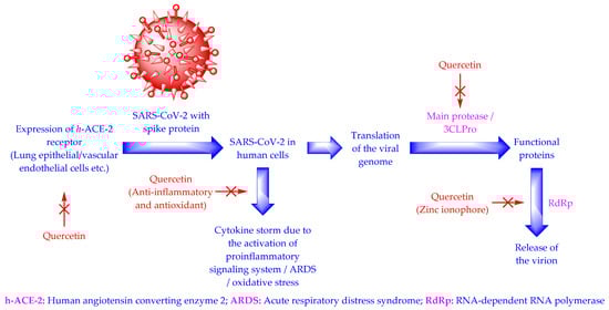 The SARS-CoV-2 virus is an RNA virus. It enters the human cell through the angiotensin-converting enzyme 2 receptors (hACE-2) [5,6,9]. The virus’s entry into the human cell causes the release of pro-inflammatory substances, oxidative stress, and acute respiratory distress syndrome [25,26]. The virus needs 3CLPro (main protease enzyme) and RNA-dependent RNA polymerase (RdRp) for its replication [5,6,9]. Quercetin demonstrates anti-COVID-19/anti-SARS-CoV-2 activity by lowering/inhibiting the expression of the hACE-2, the release of pro-inflammatory substances, 3CLPro, and RdRp [12,27,28,29] (Figure 3).