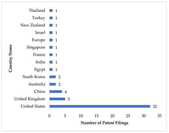 The authors searched the patent literature on quercetin and COVID-19. Most of the patent applications were filed in the United States (Figure 4). The majority of these patent applications were published in 2021, which is expected. Many of these patent applications provide evidence (in silico, in vitro, in vivo, and clinical studies) for the prophylactic/therapeutic potential of quercetin and its nutraceutical/pharmaceutical compositions (oral and inhale formulations) against COVID-19 (Table 2).