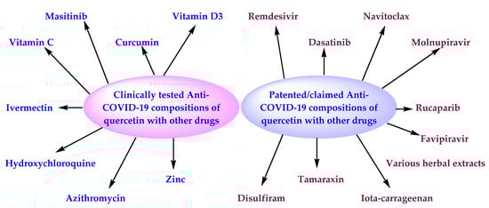 The anti-SARS-CoV-2 effect of quercetin in specific doses (12.5 to 100 μg/mL) is claimed in a Chinese patent application [57]. This patent application filing also strengthens the concept of utilizing quercetin as an anti-COVID-19 agent. The combinations of quercetin with favipiravir, remdesivir, molnupiravir, navitoclax, dasatinib, disulfiram, rucaparib, tamarixin, iota-carrageenan, and various herbal extracts (aloe, poria, rosemary, and sphagnum) are also claimed in patent applications (Table 2 and Figure 5) [43,44,45,46,47,48,49,50,51,52,53,58]. Most of these combinations were developed as an oral dosage form (tablet, solution, capsule, oral inhaler, etc.), and reveal synergistic/additive anti-SARS-CoV-2 effects. It is quite interesting to note that the patent applications claim combinations of quercetin with a large number of antioxidants, antivirals, immunomodulators, and anti-inflammatory agents. However, these patent applications exemplify the anti-SARS-CoV-2 effect of only a few combinations (Table 2). This indicates that there are a large number of experimentally unexplored quercetin combinations. Therefore, there is a high possibility that some of the experimentally unexplored quercetin combinations may provide unexpected/surprising results against COVID-19.