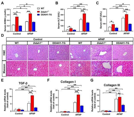 3.1. DDAH1 Protects against APAP-Induced Liver Dysfunction and Fibrosis