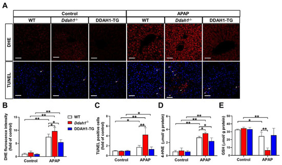 It has been reported that the hepatotoxicity of APAP is closely related with oxidative stress and apoptosis [17]. To assess the effect of APAP treatment on hepatic ROS generation and apoptosis, liver sections were stained with DHE and TUNEL, respectively. In the livers of control mice, the fluorescence intensity of DHE was very weak, and there were little TUNEL-positive cells (indicated by the arrow). APAP treatment significantly increased DHE fluorescence intensity and TUNEL-positive cells in liver sections from WT, Ddah1-/- and DDAH1-TG mice. However, liver sections from Ddah1-/- exhibited higher DHE fluorescence intensity and more TUNEL-positive cells than those of WT mice, indicating that APAP caused higher superoxide levels and more apoptotic cells in the livers of Ddah1-/- mice than in WT mice. In addition, DDAH1 overexpression did not affect the number of apoptotic cells but decreased hepatic superoxide levels in APAP-challenged mice (Figure 2A–C). To further confirm that DDAH1 affects APAP-induced hepatic oxidative stress, the levels of 4-HNE and GSH were also measured. APAP challenge resulted in significant increases in 4-HNE levels and decreases in GSH levels, and these changes were significantly greater in the livers of Ddah1-/- mice. DDAH1 overexpression decreased 4-HNE levels but had no obvious effect on GSH levels (Figure 2D,E).