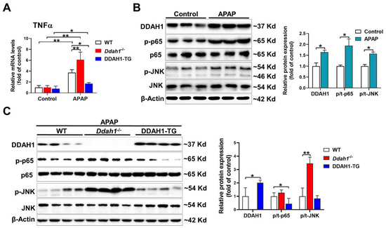 DDAH1 attenuated hepatic inflammatory response in APAP-treated mice. (A) The mRNA levels of TNFα were measured by real-time qPCR. (B,C) Liver lysates were examined by Western blot. n = 3–5, values are expressed as means ± SD; * indicates p < 0.05; ** indicates p < 0.01.