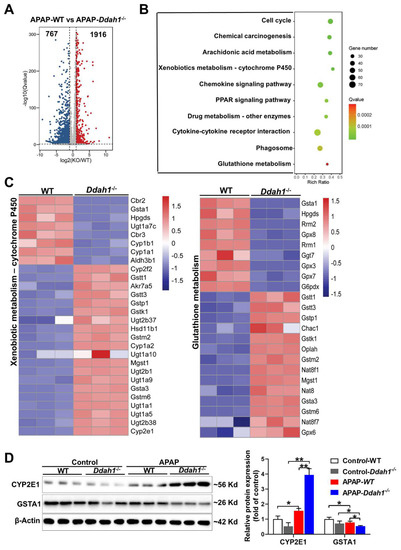 To further reveal the molecular mechanism by which DDAH1 protects against APAP-induced liver injury, the changes in the whole-genome expression profile of APAP-challenged livers were analyzed by RNA sequencing technique. We identified 1916 up-regulated and 767 down-regulated DEGs in the comparison of APAP-treated WT and Ddah1-/- livers. The fold change of these identified DEGs was visualized by a volcano plot (Figure 4A). We also performed KEGG pathway enrichment analysis and found that the DEGs were mainly significantly enriched in metabolic and inflammatory pathways, including arachidonic acid metabolism, xenobiotic metabolism, glutathione metabolism, chemokine signaling pathway, and cytokine–cytokine receptor interaction pathways (Figure 4B). The expression of the DEGs involved in xenobiotic metabolism-cytochrome P450 and glutathione metabolism pathways was visualized in heatmaps (Figure 4C). Some detoxification or antioxidant related genes, including Gsta1, Aldh3b1 and GPX3/8/7, were downregulated in Ddah1-/- livers. GSTA1 is the main glutathione S-transferase in human liver and is a sensitive and accurate indicator of liver injury [18]. Western blot results showed that APAP increased CYP2E1 expression and decreased GSTA1 expression. The APAP-induced upregulation of CYP2E1 and downregulation of GSTA1 were aggravated in the livers of Ddah1-/- mice (Figure 4D).
