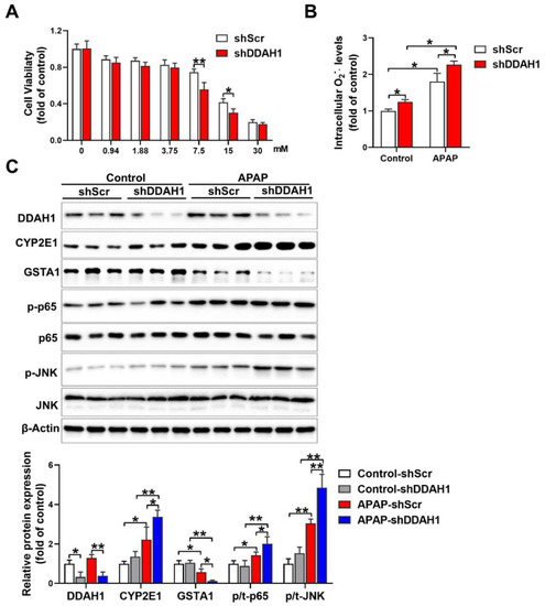 Effect of DDAH1 knockdown on APAP-induced cell death, oxidative stress and inflammatory pathways. (A) HepG2 cells stably transfected with shRNA lentiviral vectors targeting DDAH1 (shDDAH1) or a scrambled sequence (shScr) were treated with different concentrations of APAP for 24 h, and then cell viability was measured. (B) After incubation with 15 mM APAP for 24 h, the intracellular superoxide levels were determined. (C) Control and DDAH1-depleted cells were treated with 15 mM APAP for 24 h, and cell lysates were examined by Western blot. (A), n = 8; (B), n = 5; (C), n = 3; values are expressed as means ± SD; * indicates p < 0.05; ** indicates p < 0.01.