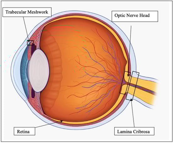 Glaucoma, an age-dependent disease which is more common in the elderly population, is a common cause of visual impairment, with a prevalence of 3.5% in those over the age of 40 and 9% in those over 80 [1,2]. It is the leading cause of irreversible blindness worldwide, with an estimated 79.6 million people suffering the effects of glaucoma in 2020, a number which is expected to increase to 111 million by 2040 [3]. It can be defined as an irreversible and progressive optic neuropathy [4]. Glaucoma is associated with visual field loss, primarily from damage to retinal ganglion cell (RGC) axons as they exit the eye via the optic nerve head (ONH). Glaucoma may be classified as either open, in which the anterior chamber angle remains open, or closed, whereby the aqueous outflow is impaired due to appositional closure of the drainage angle. Both forms may be primary or secondary processes. While the majority of patients with glaucoma have an elevated intraocular pressure (IOP), there are patients with glaucomatous optic neuropathy whose pressures lie within the normal range (normal tension glaucoma), as well as patients whose pressures are higher than normal values, yet have no damage to their ONH (ocular hypertension) [5,6]. These exceptions to the rule would suggest that raised IOP is not the only factor contributing to ONH damage; however, current therapeutic options in the management of glaucoma revolve around IOP reduction either via reduced aqueous production or increased outflow. A better understanding of the molecular pathogenesis of glaucoma will allow for the development of novel therapeutic options in the future.