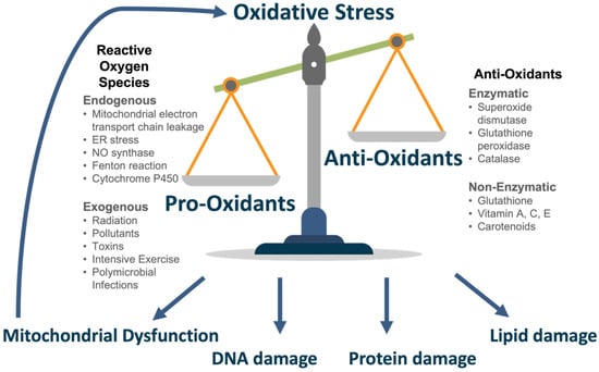 The body possesses an anti-oxidant defence system to an appropriate level of ROS in normal conditions. This is achieved primarily by enzymes. Superoxide dismutase (SOD) is involved in the conversion of hydrogen peroxide to oxygen (oxidation) and hydrogen peroxide (reduction) [38]. Glutathione peroxidase (GPx) reduces hydrogen peroxide to water or lipid hydroperoxides to their corresponding alcohols [39]. It achieves this using reduced glutathione (GSH), the most abundant anti-oxidant, as a co-factor [39,40]. Catalase is involved in degrading hydrogen peroxide to water and oxygen [41]. Further anti-oxidants include glutathione, ascorbic acid (Vitamin C), α-tocopherol (Vitamin E) and carotenoids which may be synthesised or consumed through diet [42]. In conditions of oxidative stress, the anti-oxidant capacity becomes overwhelmed and insufficient to buffer ROS levels. The delicate balance of pro- and anti-oxidants is seen in Figure 2.
