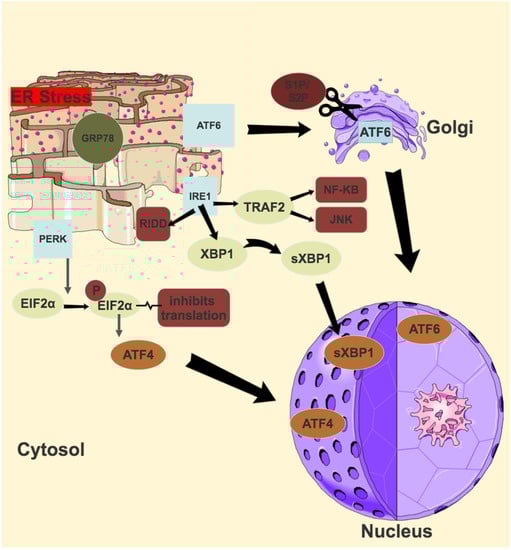 ER stress occurs when the capacity of the ER to correctly fold proteins is saturated. This stress sets off various signal transduction pathways in a bid to either return the ER to its normal equilibrium or to induce apoptosis [116]. Three of these pathways include the unfolded protein response (UPR), the ER overload response (EOR) and the ER associated degradation (ERAD). Three transmembrane ER resident proteins govern three signalling pathways in the UPR, and these are inositol requiring enzyme 1 (IRE1), activating transcription factor 6 (ATF6) and pancreatic ER kinase-like ER kinase (PERK). All three have ER lumen domains which sense ER stress, coupled to cytosolic effector domains. In a normally functioning ER, the ER lumen domains of IRE1, ATF6 and PERK are bound by glucose regulating protein 78 (GRP78) [117]. In a stressed ER, GRP 78 is titrated away, activating the UPR. The primary goal of these pathways is to restore ER protein homeostasis and ensure cell survival, but in the face of persistent activation from unmitigated ER stress, a signalling switch will occur, favouring apoptosis.
