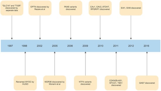 The foundations of our understanding of the role of ER stress in glaucoma were laid in 1997, with the discovery of the myocilin (MYOC) gene. The initial discovery was that an area of chromosome 1q was harbouring a gene associated with juvenile onset POAG, and this area was initially called GLC1A (picked to denote glaucoma, POAG and the fact that this was the first gene linkage site found in glaucoma) [150]. In the same year, it was then realised, that Polansky et al. had previously found, sequenced and named the gene trabecular meshwork inducible glucocorticoid response or TIGR, during studies of corticosteroid induced glaucoma [151,152]. Simultaneously, Kubota et al. in Japan had been studying retinal photoreceptors, and finding a protein similar to myosin, calling it myocilin [153]. In 1998, the Human Genome Organization stepped in and chose the name MYOC, by which the gene has been referred to as since [154]. While MYOC remains the best understood and most investigated gene linked to glaucoma, in the years since many other gene linkages have been identified. (Figure 3). The second gene identified was Optineurin (OPTN), by Rezaie et al., which is a variant with rare frequency but with a high effect size correlated with glaucoma pathogenesis [155,156]. Other similarly rare variants with high effect size in the development of POAG include WD Repeat Domain 36 (WDR36), TANK Binding Kinase 1(TBK1), Neurotrophin 4 (NTF4) and Paired Box 6 (PAX6) [157,158,159,160]. Variants of genes identified in the pathogenesis of glaucoma which are common but have a low effect size in the development of glaucoma include TMCO1, Cyclin-dependent kinase inhibitor 2B (CDKN2B-AS1 or ANRIL), Caveolin 1 (CAV1), Caveolin 2 (CAV2), Sine Oculis Homeobox Homolog 1 (SIX1), Sine Oculis Homeobox Homolog 6 (SIX6), Growth Arrest Specific Protein 7 (GAS7), Atonal BHLH Transcription Factor 7 (ATOH7) and RPGR Interacting Protein 1 (RPGRIP1) [161,162,163,164,165,166,167,168,169]. Identifying these genes not only allows us to potentially target these pathways using novel treatments, but in the future may also allow us to create DNA based tests that could identify those at risk of developing glaucoma, and potentially assist in evaluating who is at a higher risk of progression. Furthermore, identifying these genes and understanding their functions has been critical in allowing us to better understand the pathogenesis of glaucoma in their identification of key biological signalling pathways, such as those involved in ER stress, which play a role in glaucoma development and progression. The timeline of milestone gene discoveries in glaucoma is shown in Figure 4.